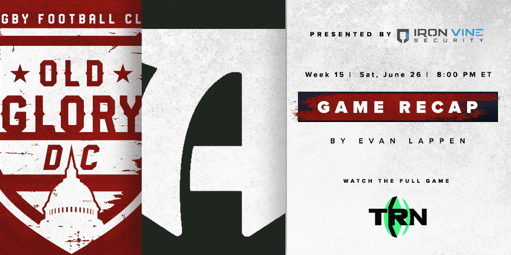 Playing for pride in Marietta, Ga., Old Glory DC took its shots but was defeated by Rugby ATL, 32-12, on Saturday night. In the second game of a doubleheader at Lupo Field, Old Glory found itself in an early 17-0 hole and was unable to climb out in the second half. With the loss and a New York win, DC was eliminated from the playoffs. Old Glory returns to Georgia next Sunday to face Toronto before ending the season with a two-game homestand against San Diego and Austin.